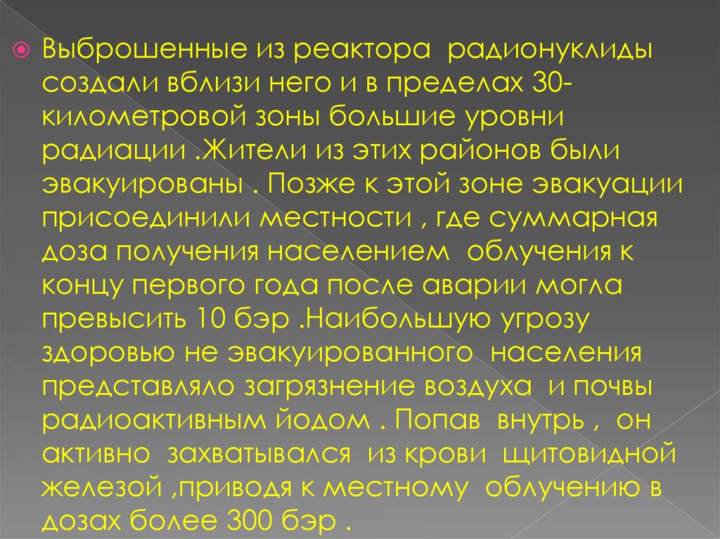 Выброшенные из реактора радионуклидысоздали вблизи него и в пределах 30километровой зоны большие уровни