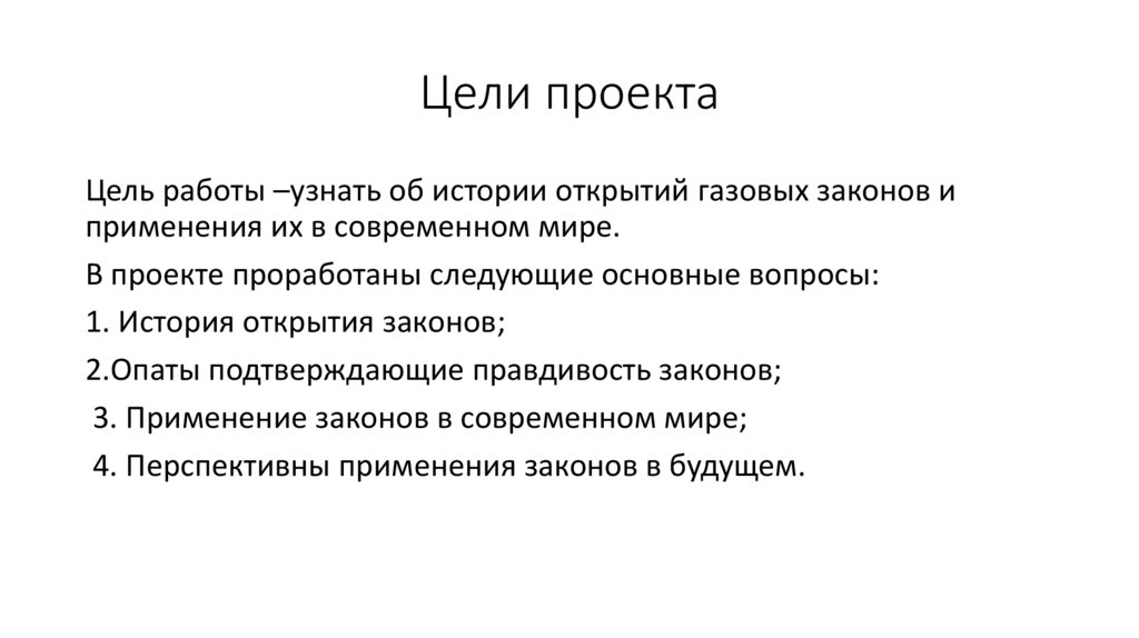 Цели проектаЦель работы –узнать об истории открытий газовых законов и