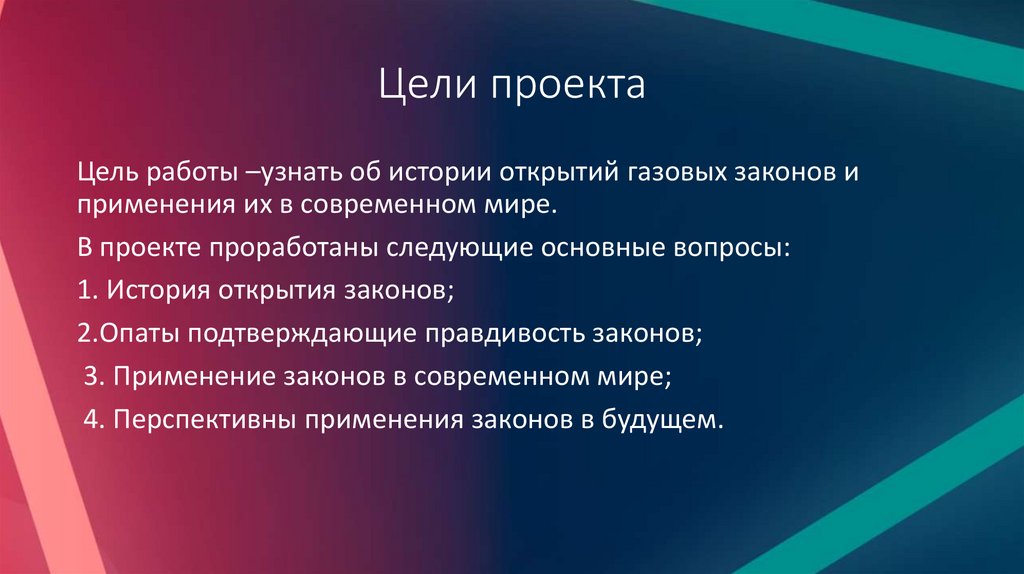 Цели проектаЦель работы –узнать об истории открытий газовых законов и