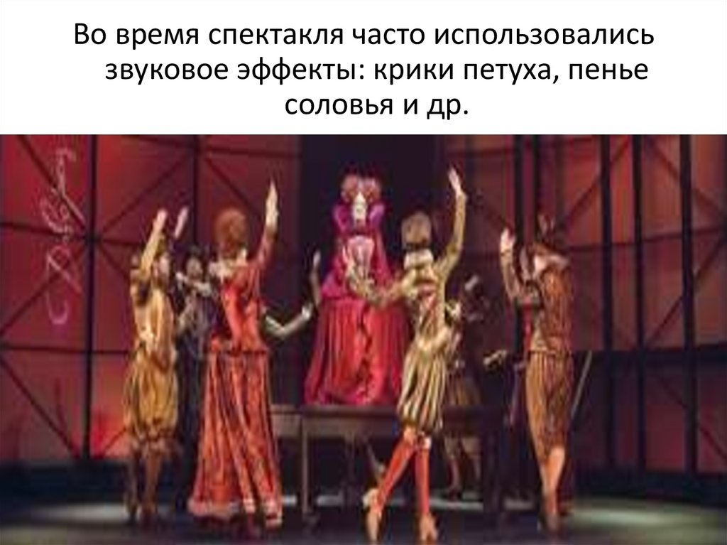 Во время спектакля часто использовалисьзвуковое эффекты: крики петуха, пенье