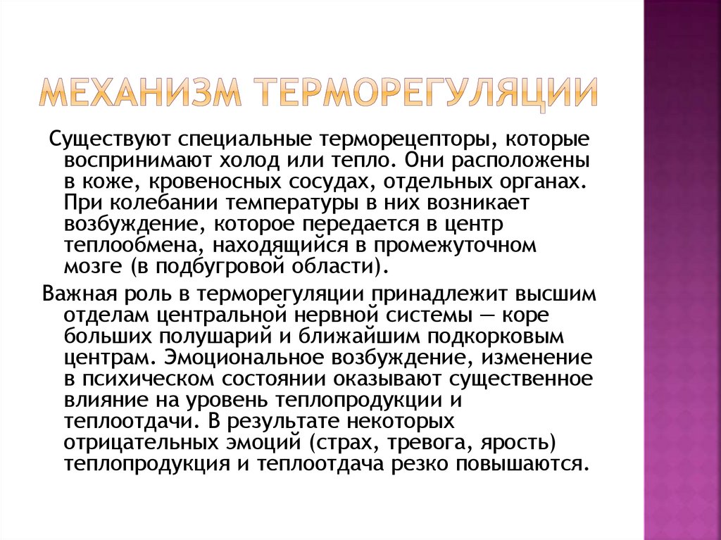Существуют специальные терморецепторы, которыевоспринимают холод или тепло. Они расположены