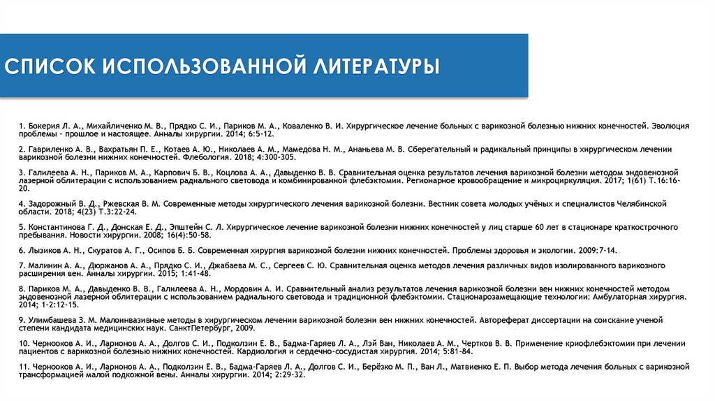 СПИСОК ИСПОЛЬЗОВАННОЙ ЛИТЕРАТУРЫ1. Бокерия Л. А., Михайличенко М. В., Прядко С. И., Париков М. А., Коваленко В. И. Хирургическое лечение больных с варикозной болезнью нижних конечностей. Эволюция