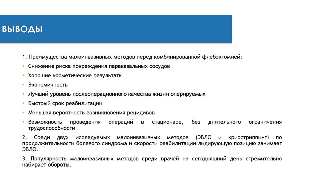 ВЫВОДЫ1. Преимущества малоинвазивных методов перед комбинированной флебэктомией: