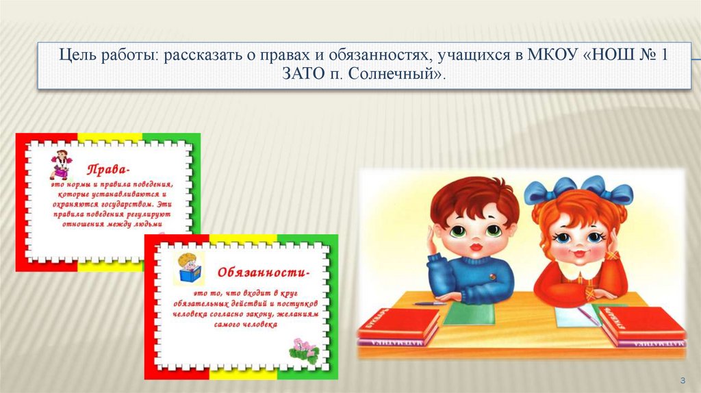 Цель работы: рассказать о правах и обязанностях, учащихся в МКОУ «НОШ № 1ЗАТО п. Солнечный».