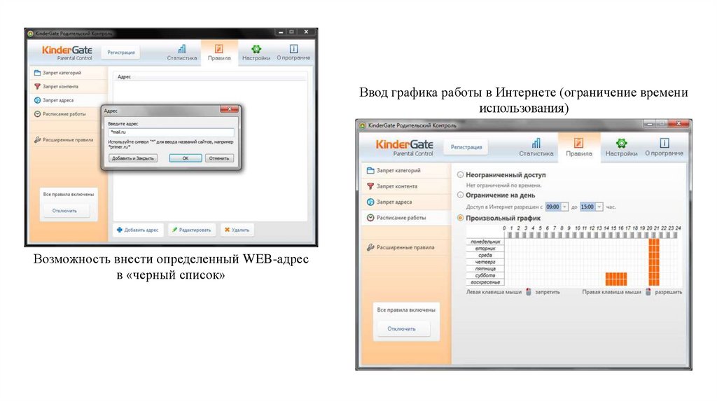 Ввод графика работы в Интернете (ограничение временииспользования)