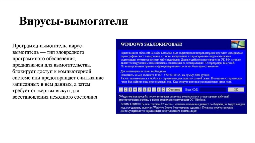 Вирусы-вымогателиПрограмма-вымогатель, вирусвымогатель — тип зловредного