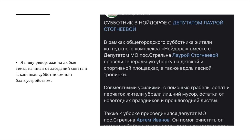 • Я пишу репортажи на любыетемы, начиная от заседаний совета и