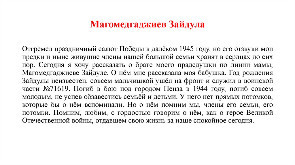 Магомедгаджиеве Зайдуле. О нём мне рассказала моя бабушка. Год рождения
