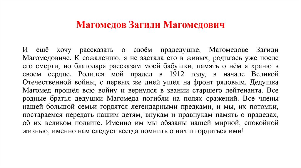 Магомедов Загиди МагомедовичИ ещё хочу рассказать о своём прадедушке, Магомедове Загиди