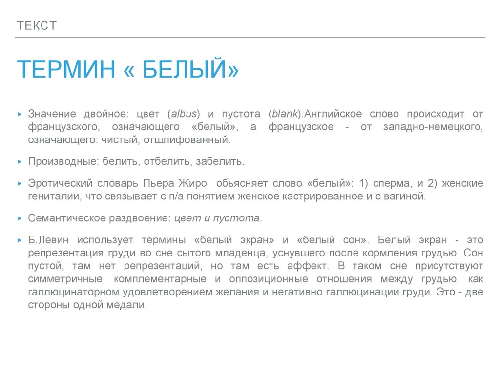 ▸ Эротический словарь Пьера Жиро обьясняет слово «белый»: 1) сперма, и 2) женские