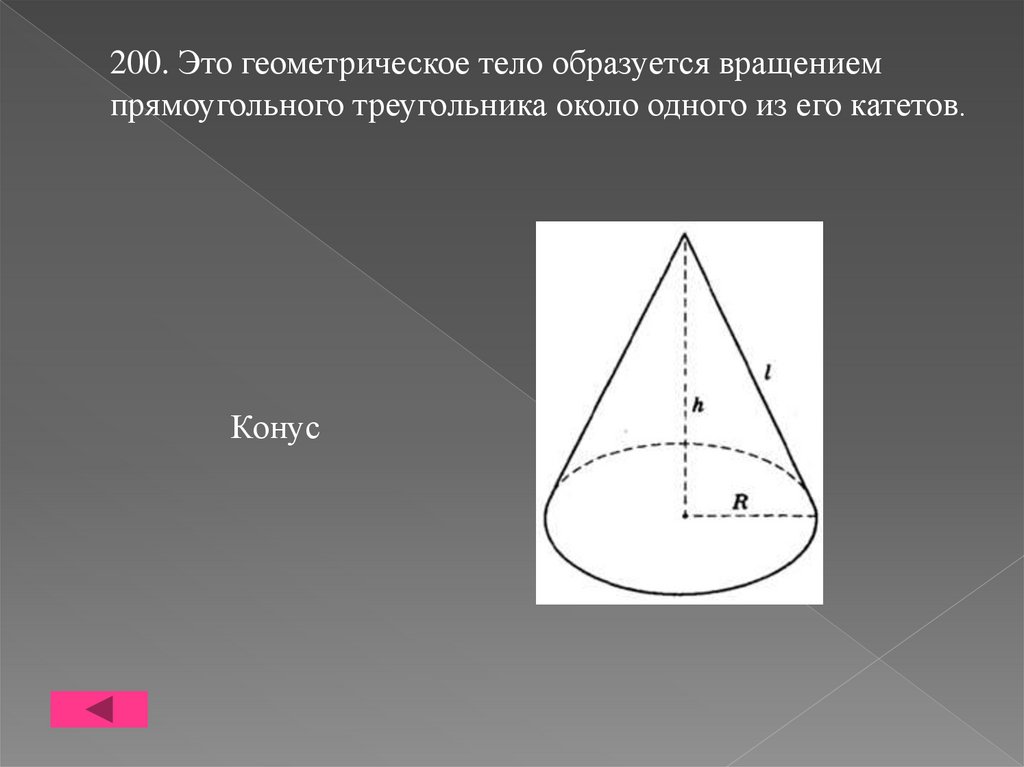 200. Это геометрическое тело образуется вращениемпрямоугольного треугольника около одного из его катетов.