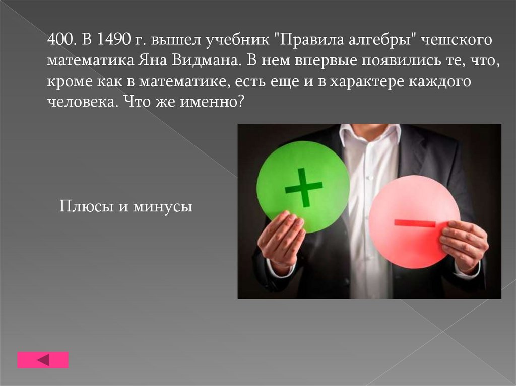 400. В 1490 г. вышел учебник "Правила алгебры" чешскогоматематика Яна Видмана. В нем впервые появились те, что,