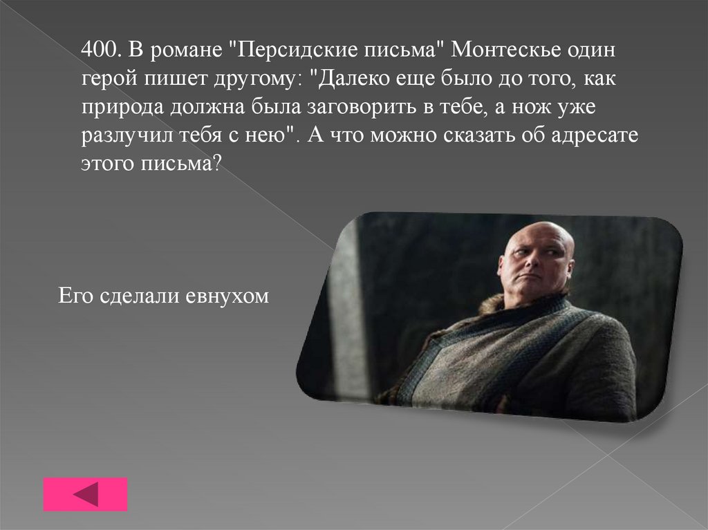 400. В романе "Персидские письма" Монтескье одингерой пишет другому: "Далеко еще было до того, как