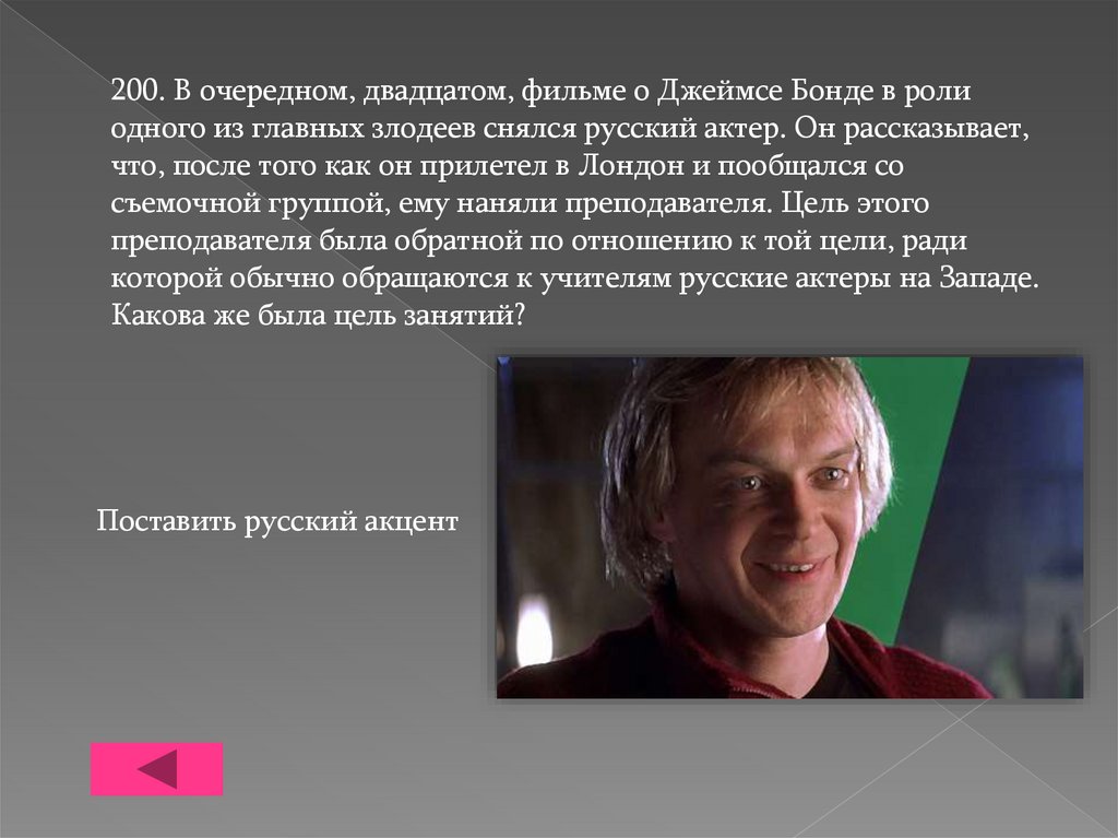 200. В очередном, двадцатом, фильме о Джеймсе Бонде в ролиодного из главных злодеев снялся русский актер. Он рассказывает,