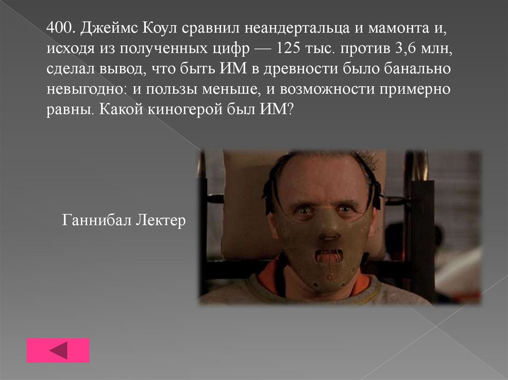 400. Джеймс Коул сравнил неандертальца и мамонта и,исходя из полученных цифр — 125 тыс. против 3,6 млн,
