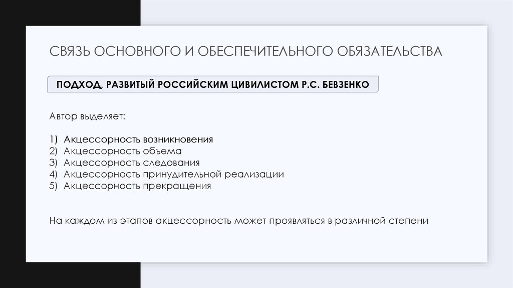 СВЯЗЬ ОСНОВНОГО И ОБЕСПЕЧИТЕЛЬНОГО ОБЯЗАТЕЛЬСТВАПОДХОД, РАЗВИТЫЙ РОССИЙСКИМ ЦИВИЛИСТОМ Р.С. БЕВЗЕНКО