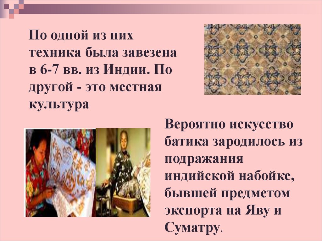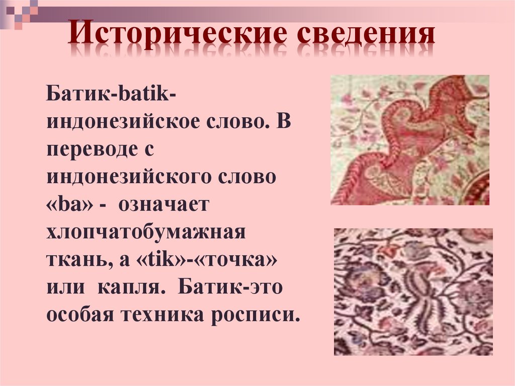 Исторические сведенияБатик-batikиндонезийское слово. В