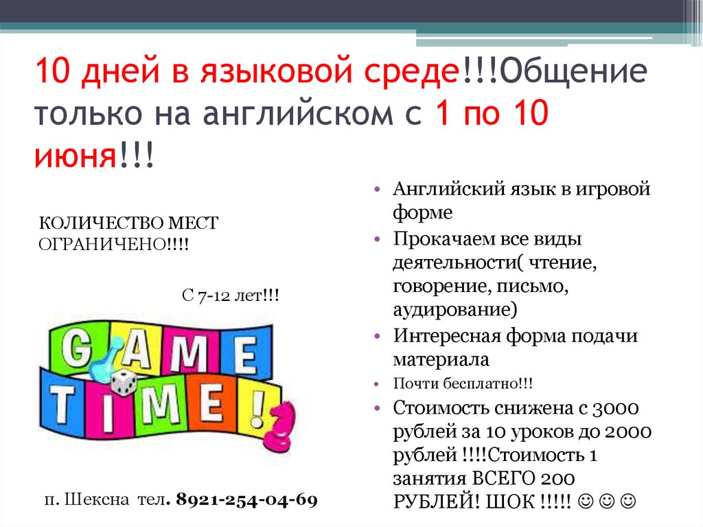 10 дней в языковой среде!!!Общениетолько на английском с 1 по 10