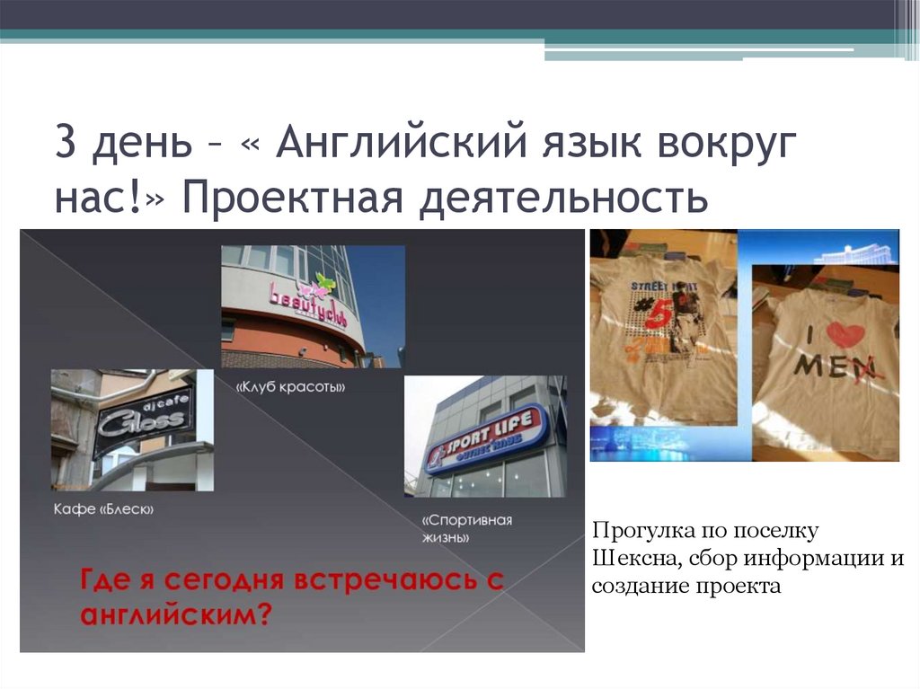 3 день – « Английский язык вокругнас!» Проектная деятельность