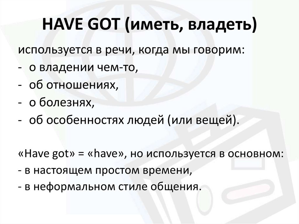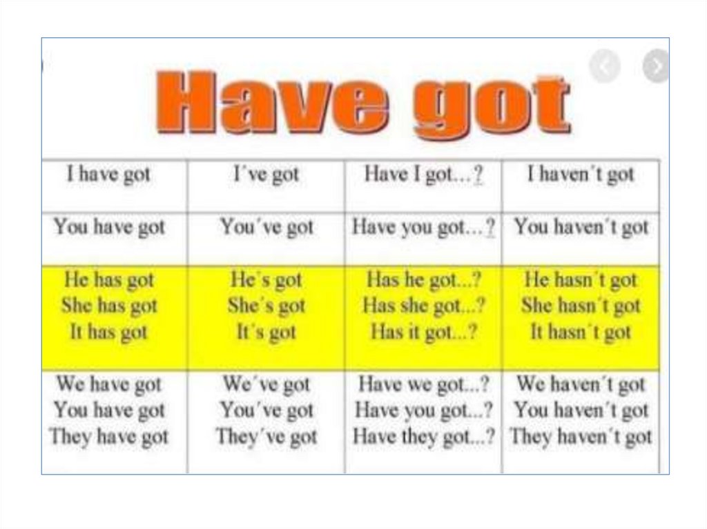 HAVE GOT (иметь, владеть)используется в речи, когда мы говорим: