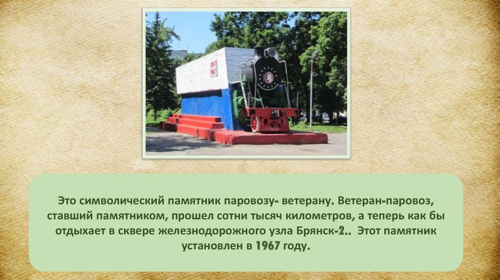 Это символический памятник паровозу- ветерану. Ветеран-паровоз,ставший памятником, прошел сотни тысяч километров, а теперь как бы