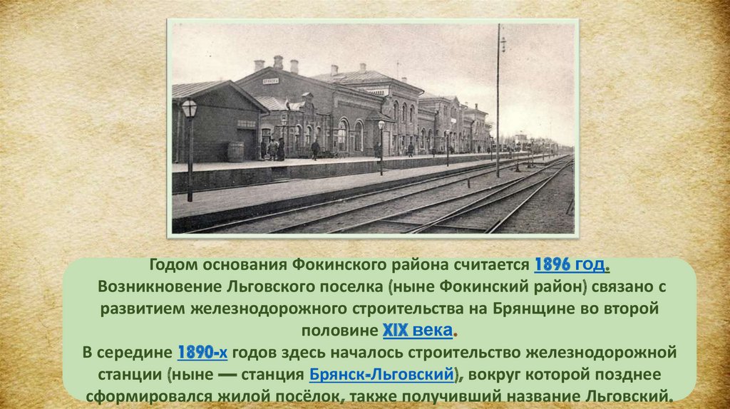 Годом основания Фокинского района считается 1896 год.Возникновение Льговского поселка (ныне Фокинский район) связано с