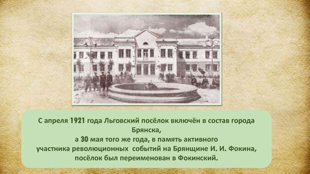 С апреля 1921 года Льговский посёлок включён в состав городаБрянска,