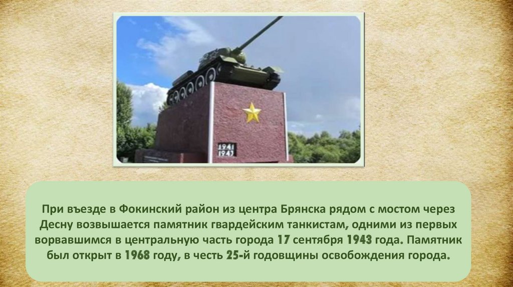 При въезде в Фокинский район из центра Брянска рядом с мостом черезДесну возвышается памятник гвардейским танкистам, одними из первых