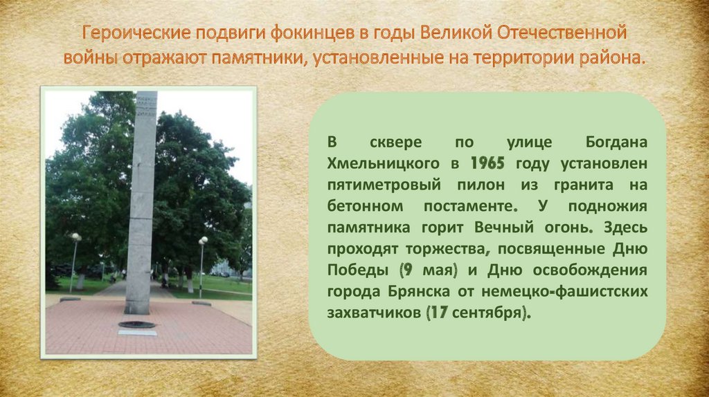 Героические подвиги фокинцев в годы Великой Отечественнойвойны отражают памятники, установленные на территории района.