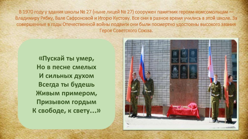 В 1970 году у здания школы № 27 (ныне лицей № 27) сооружен памятник героям-комсомольцам —Владимиру Рябку, Вале Сафроновой и Игорю Кустову. Все они в разное время учились в этой школе. За