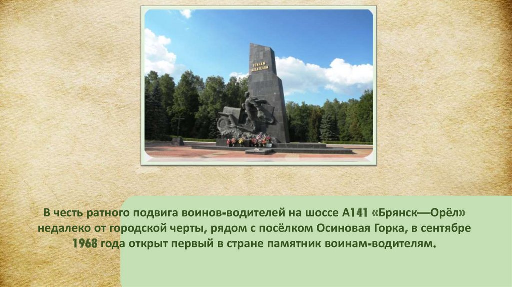 В честь ратного подвига воинов-водителей на шоссе А141 «Брянск—Орёл»недалеко от городской черты, рядом с посёлком Осиновая Горка, в сентябре