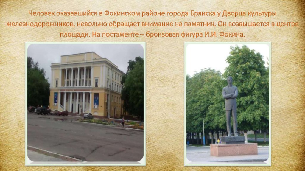 Человек оказавшийся в Фокинском районе города Брянска у Дворца культурыжелезнодорожников, невольно обращает внимание на памятник. Он возвышается в центре