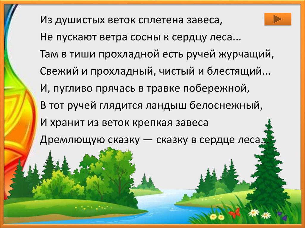 Из душистых веток сплетена завеса,Не пускают ветра сосны к сердцу леса...
