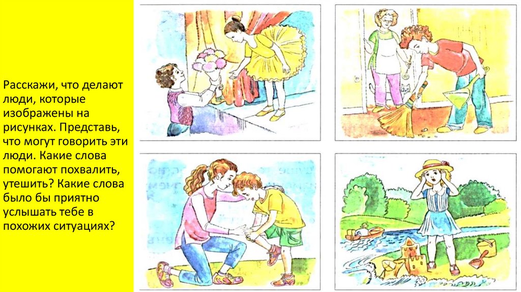 РАССМОТРИ РИСУНКИ. РАССКАЖИ, ГДЕ ПРОИСХОДЯТ СОБЫТИЯ, КОТОРЫЕ НАНИХ ИЗОБРАЖЕНЫ. КТО В НИХ УЧАСТВУЕТ? ПРЕДСТАВЬ, ЧТО МОГУТ ГОВОРИТЬ