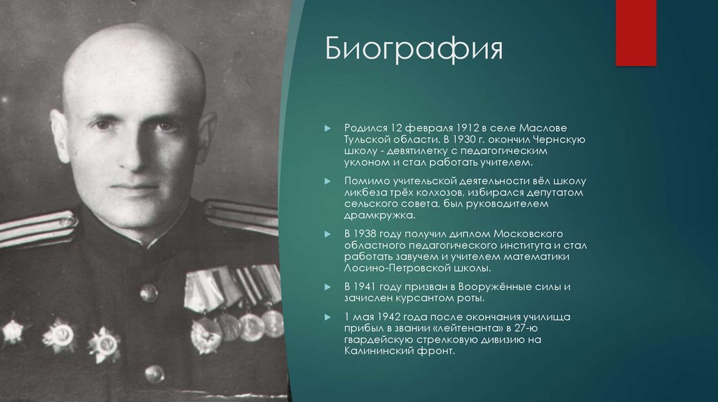 БиографияРодился 12 февраля 1912 в селе Маслове