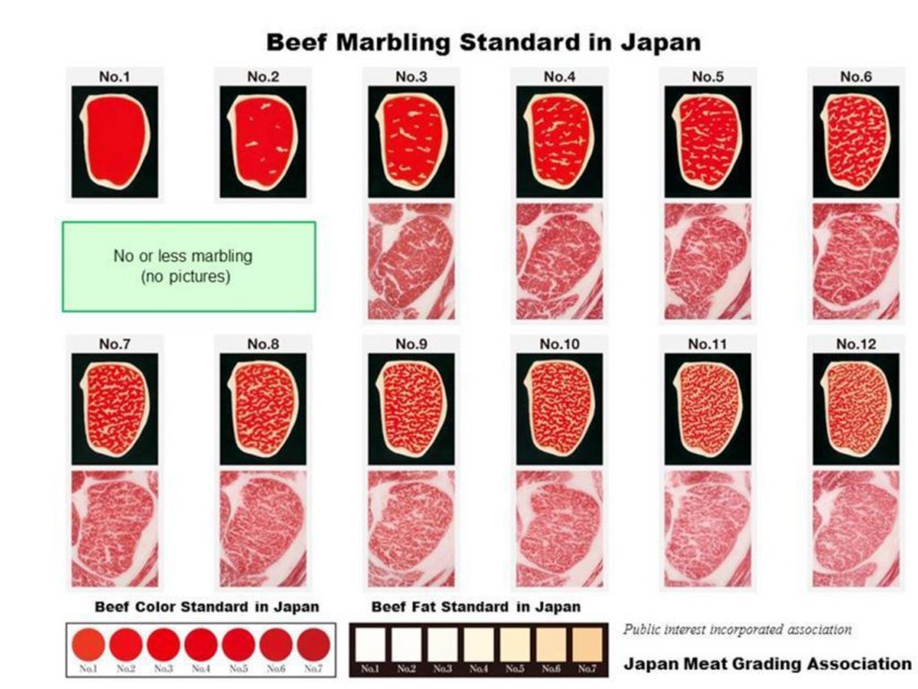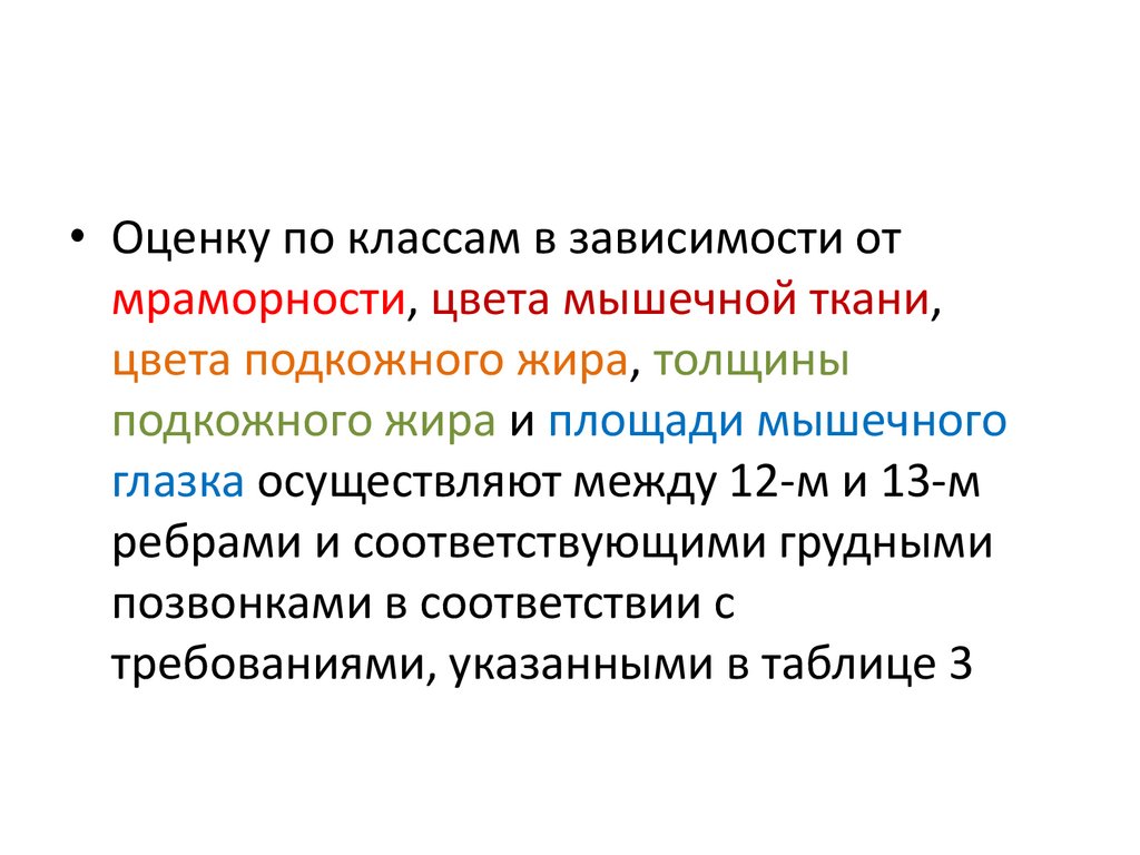 • Оценку по классам в зависимости отмраморности, цвета мышечной ткани,