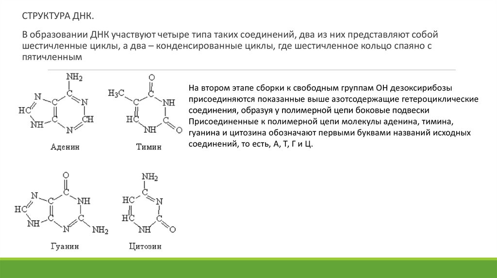 СТРУКТУРА ДНК.В образовании ДНК участвуют четыре типа таких соединений, два из них представляют собой
