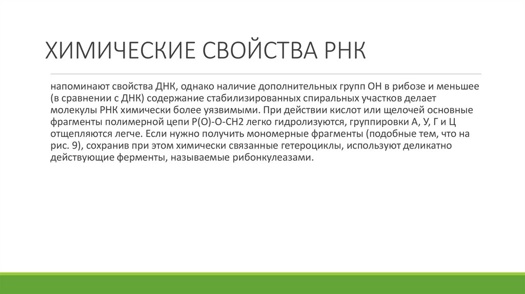 ХИМИЧЕСКИЕ СВОЙСТВА РНКнапоминают свойства ДНК, однако наличие дополнительных групп ОН в рибозе и меньшее