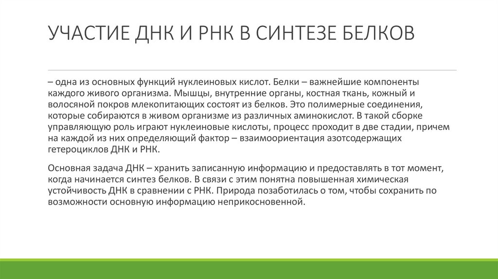УЧАСТИЕ ДНК И РНК В СИНТЕЗЕ БЕЛКОВ– одна из основных функций нуклеиновых кислот. Белки – важнейшие компоненты