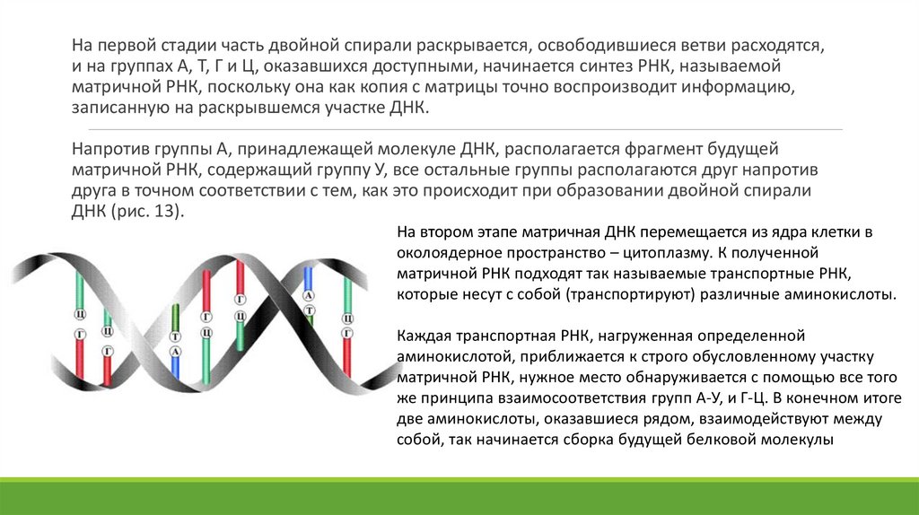На первой стадии часть двойной спирали раскрывается, освободившиеся ветви расходятся,и на группах А, Т, Г и Ц, оказавшихся доступными, начинается синтез РНК, называемой