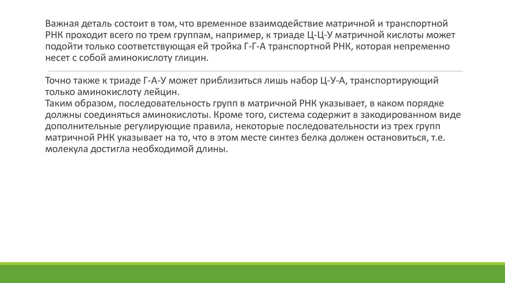 Важная деталь состоит в том, что временное взаимодействие матричной и транспортнойРНК проходит всего по трем группам, например, к триаде Ц-Ц-У матричной кислоты может