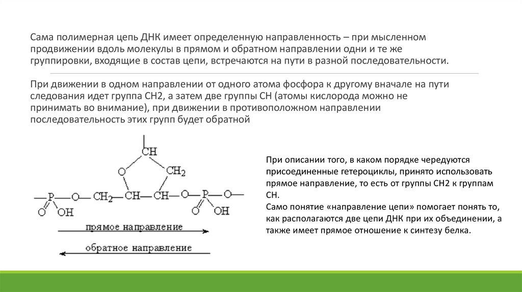 Сама полимерная цепь ДНК имеет определенную направленность – при мысленномпродвижении вдоль молекулы в прямом и обратном направлении одни и те же