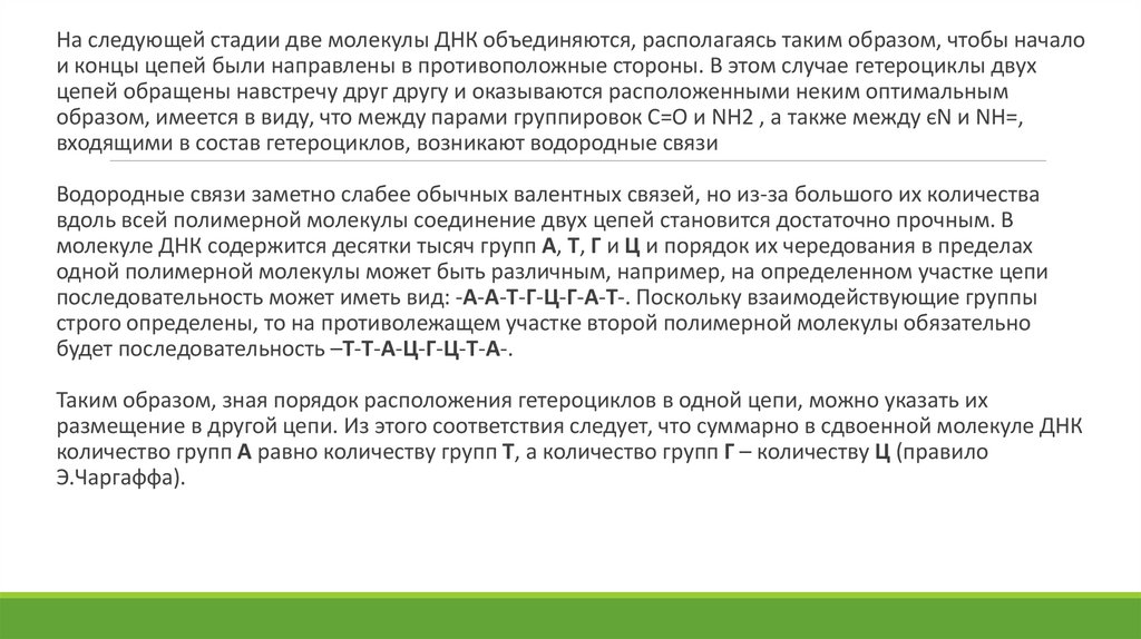 На следующей стадии две молекулы ДНК объединяются, располагаясь таким образом, чтобы началои концы цепей были направлены в противоположные стороны. В этом случае гетероциклы двух