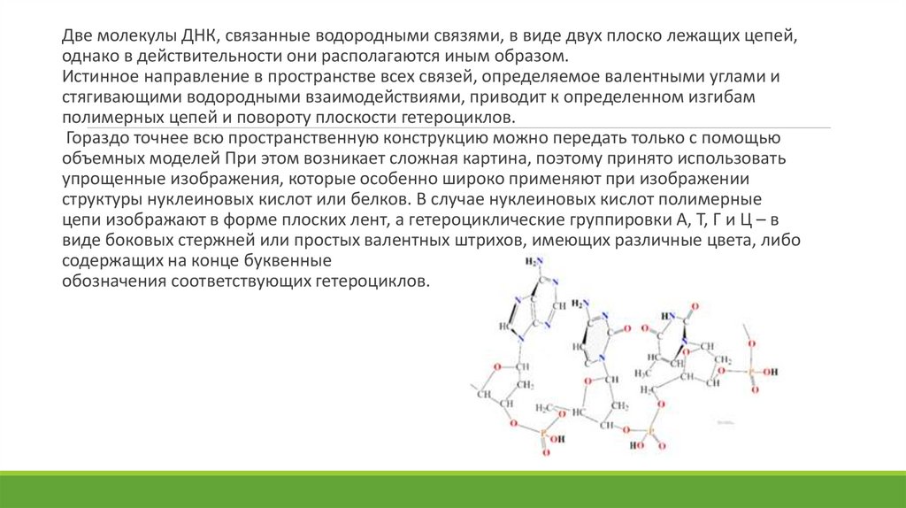 Две молекулы ДНК, связанные водородными связями, в виде двух плоско лежащих цепей,однако в действительности они располагаются иным образом.