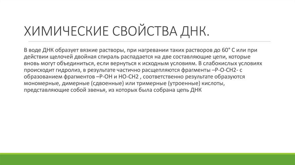 ХИМИЧЕСКИЕ СВОЙСТВА ДНК.В воде ДНК образует вязкие растворы, при нагревании таких растворов до 60° С или при