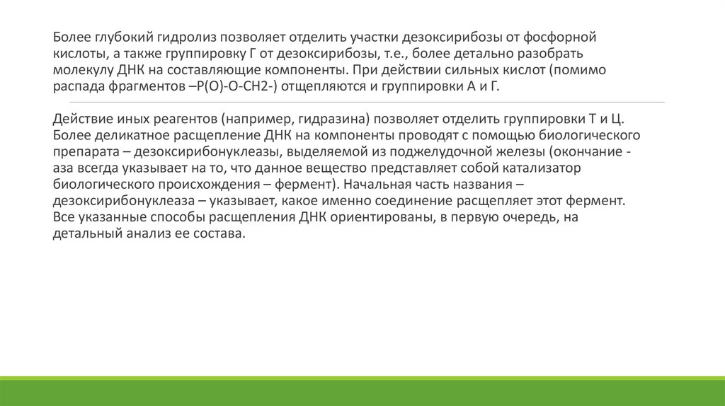 Более глубокий гидролиз позволяет отделить участки дезоксирибозы от фосфорнойкислоты, а также группировку Г от дезоксирибозы, т.е., более детально разобрать