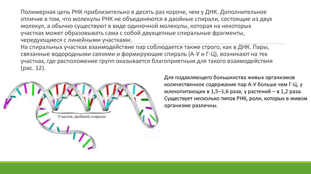 Полимерная цепь РНК приблизительно в десять раз короче, чем у ДНК. Дополнительноеотличие в том, что молекулы РНК не объединяются в двойные спирали, состоящие из двух