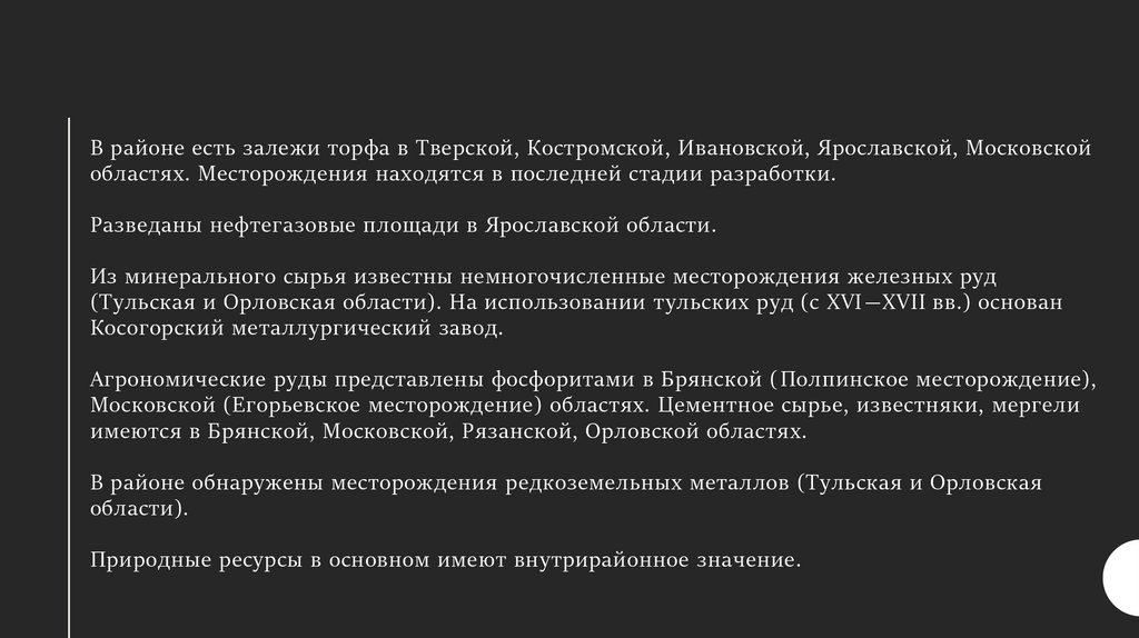 В районе есть залежи торфа в Тверской, Костромской, Ивановской, Ярославской, Московскойобластях. Месторождения находятся в последней стадии разработки.