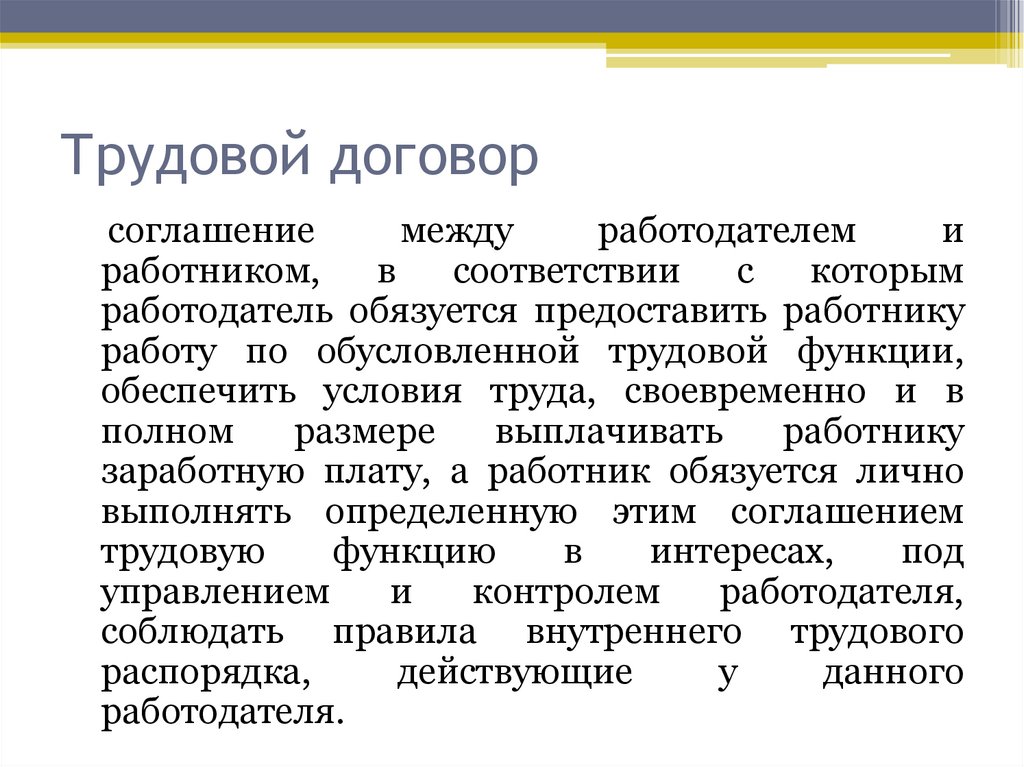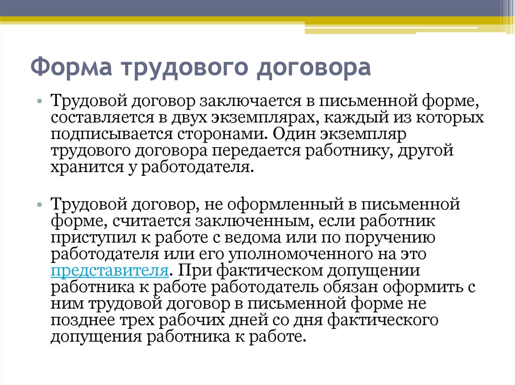 Форма трудового договора• Трудовой договор заключается в письменной форме,