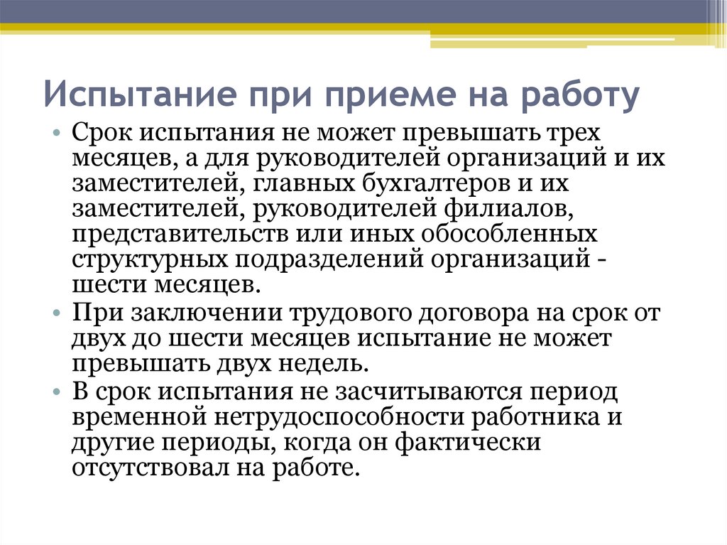 Испытание при приеме на работу• Срок испытания не может превышать трех